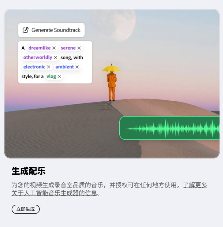 生成式AI模型、大规模图像训练(Adobe Stock数据集)、Content Credentials内容溯源技术、多模态AI(图像/视频/音频生成)
