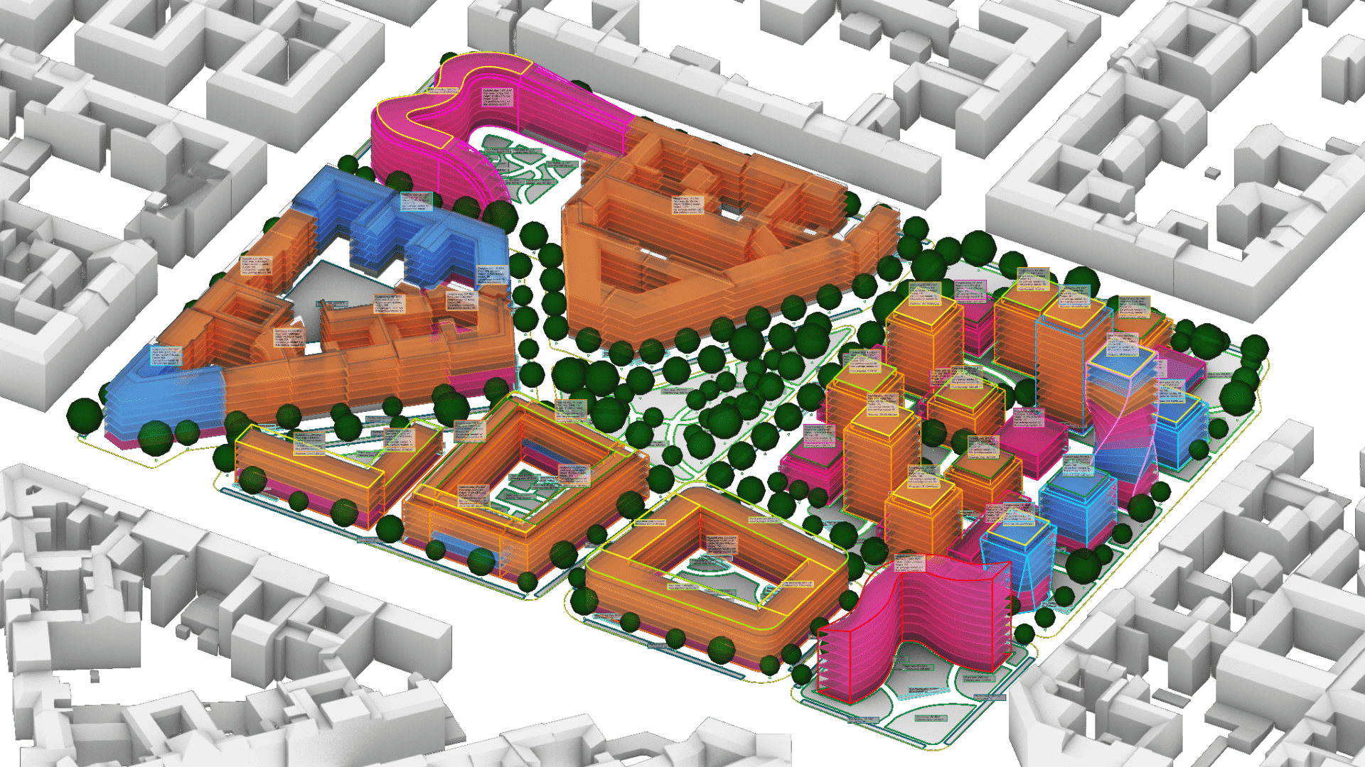 深度集成于Rhino的参数化建模环境,结合地理信息系统(GIS)数据处理能力,能够进行大规模空间数据分析。核心是一个实时计算引擎,在设计变更时快速更新各项性能指标。