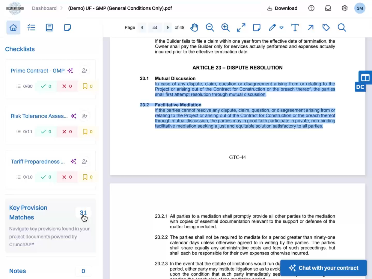 Document Crunch通过AI技术解决建筑行业合同审查耗时长、风险识别不全面的痛点。核心价值在于: