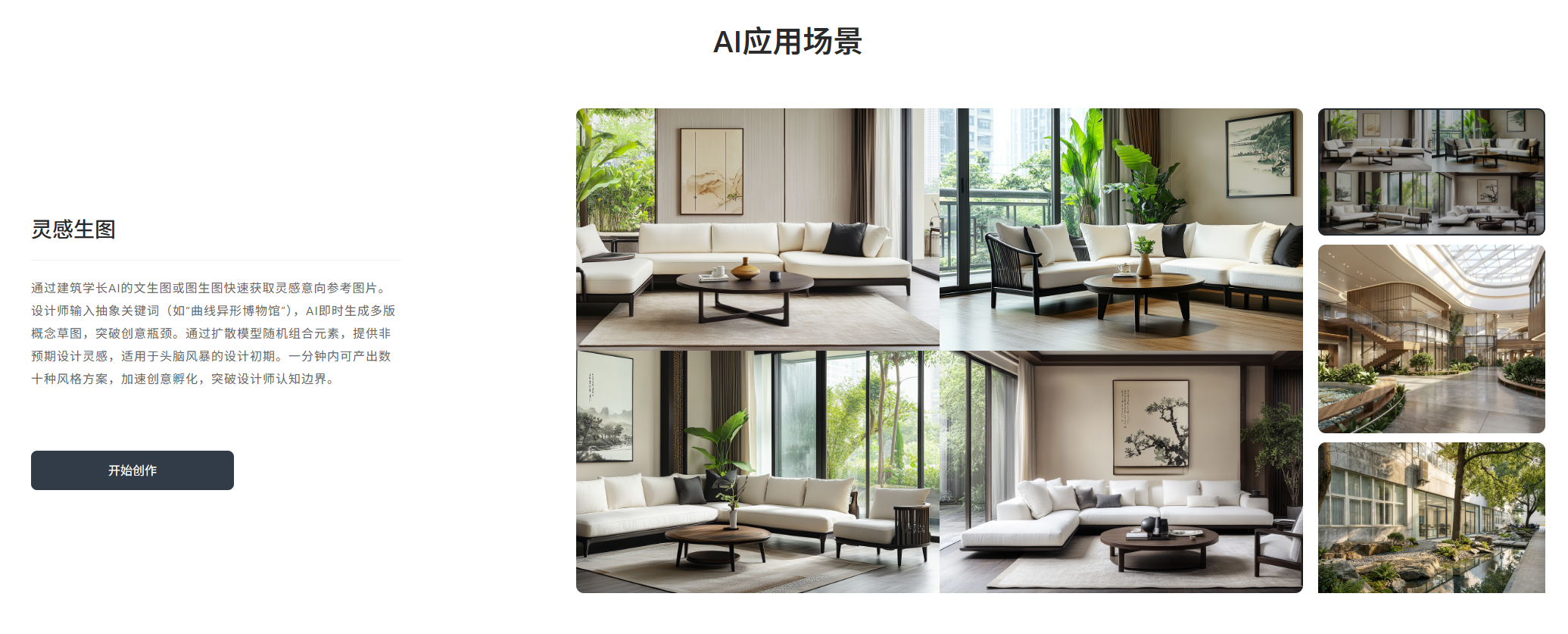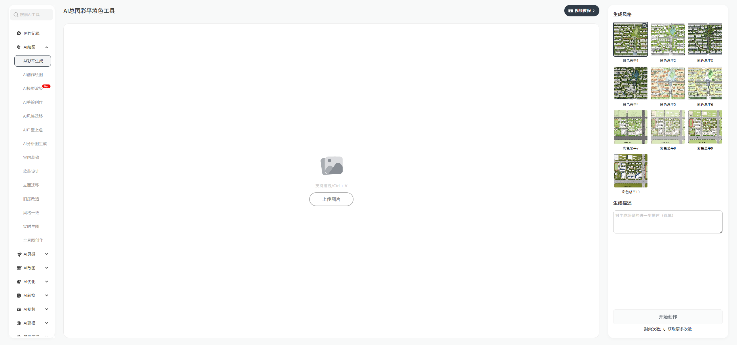 - AI绘图创作:文生图、图生图快速生成建筑、室内、景观、规划效果图,支持多种风格和类型