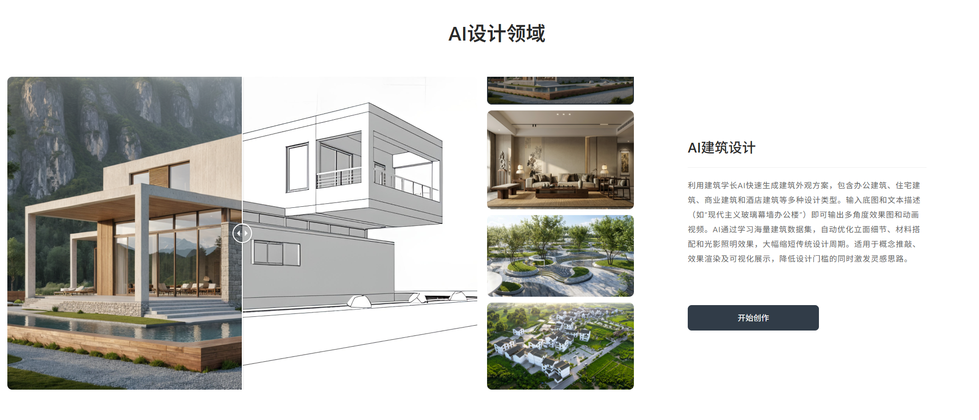 - AI快速生成效果图:通过AI快速生成建筑外观、室内、景观、规划方案效果图,输入底图和文本描述即可输出多角度效果图和动画视频;