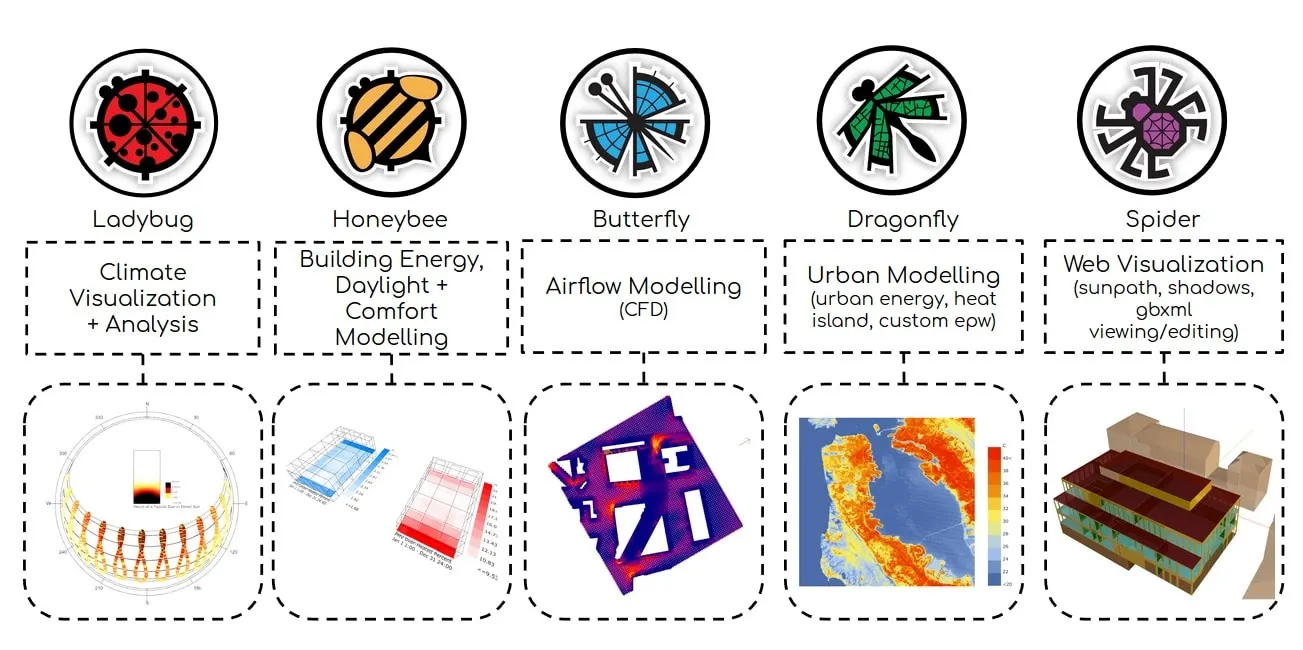 - 连接 EnergyPlus/OpenStudio 进行建筑能耗、HVAC 规模计算、热舒适度分析,连接 Radiance 进行采光和眩光模拟;