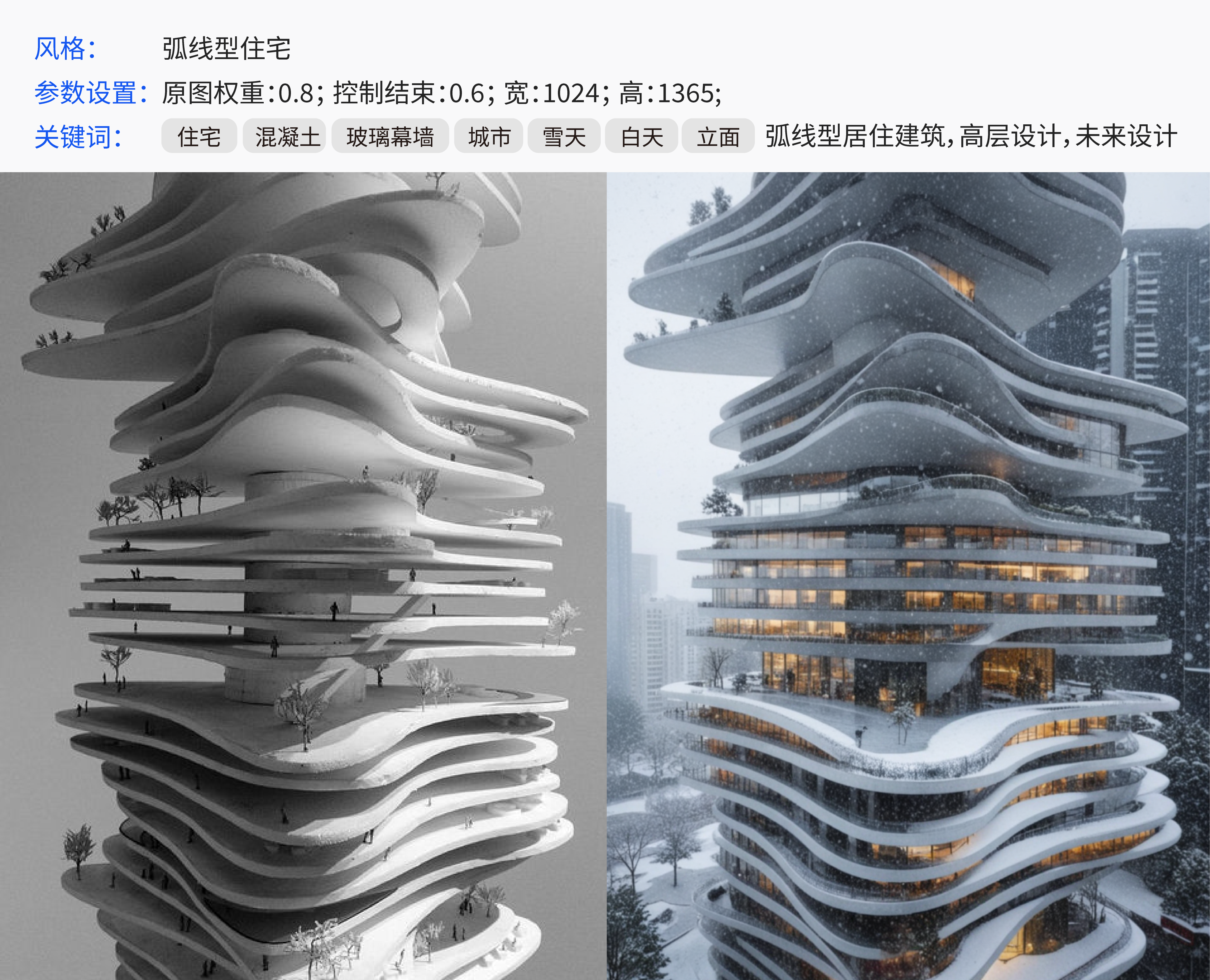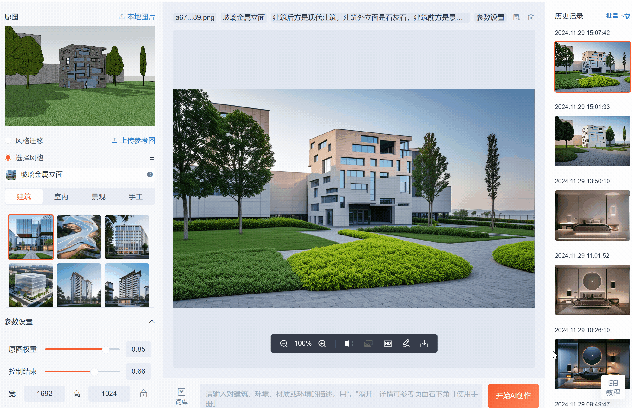 基于生成式AI技术的图像生成算法,针对建筑行业的专业术语进行优化,能精准捕捉并理解天气、环境和材质等建筑要素。采用扩散模型(Diffusion Model)等先进AI技术