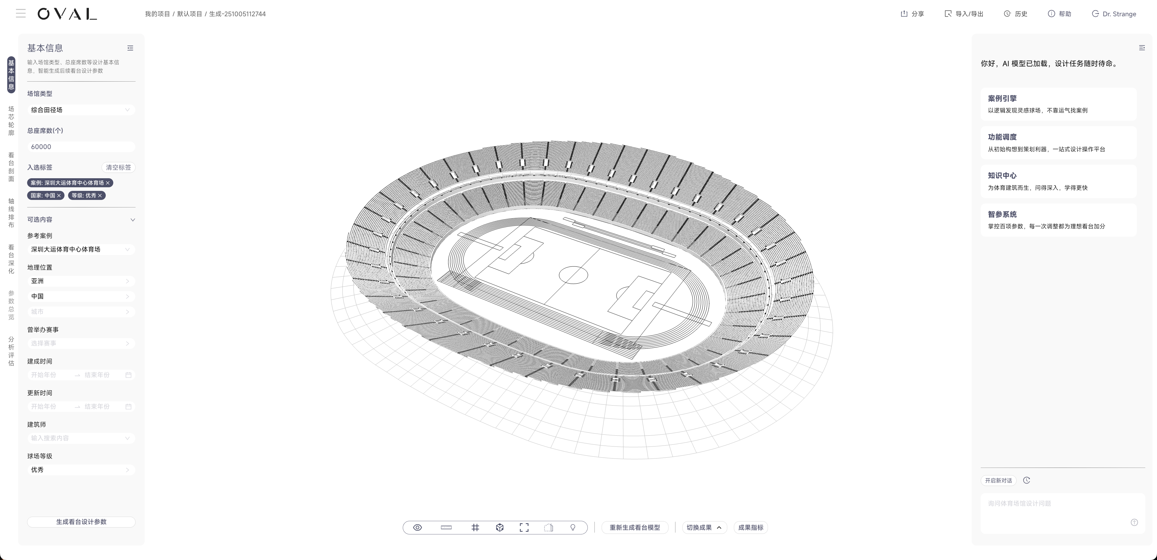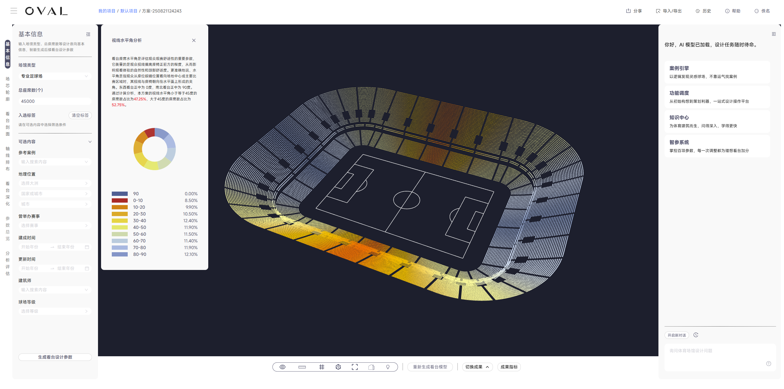 - 内置体育建筑知识库的AI助手,通过自然语言交互辅助参数修改与方案优化