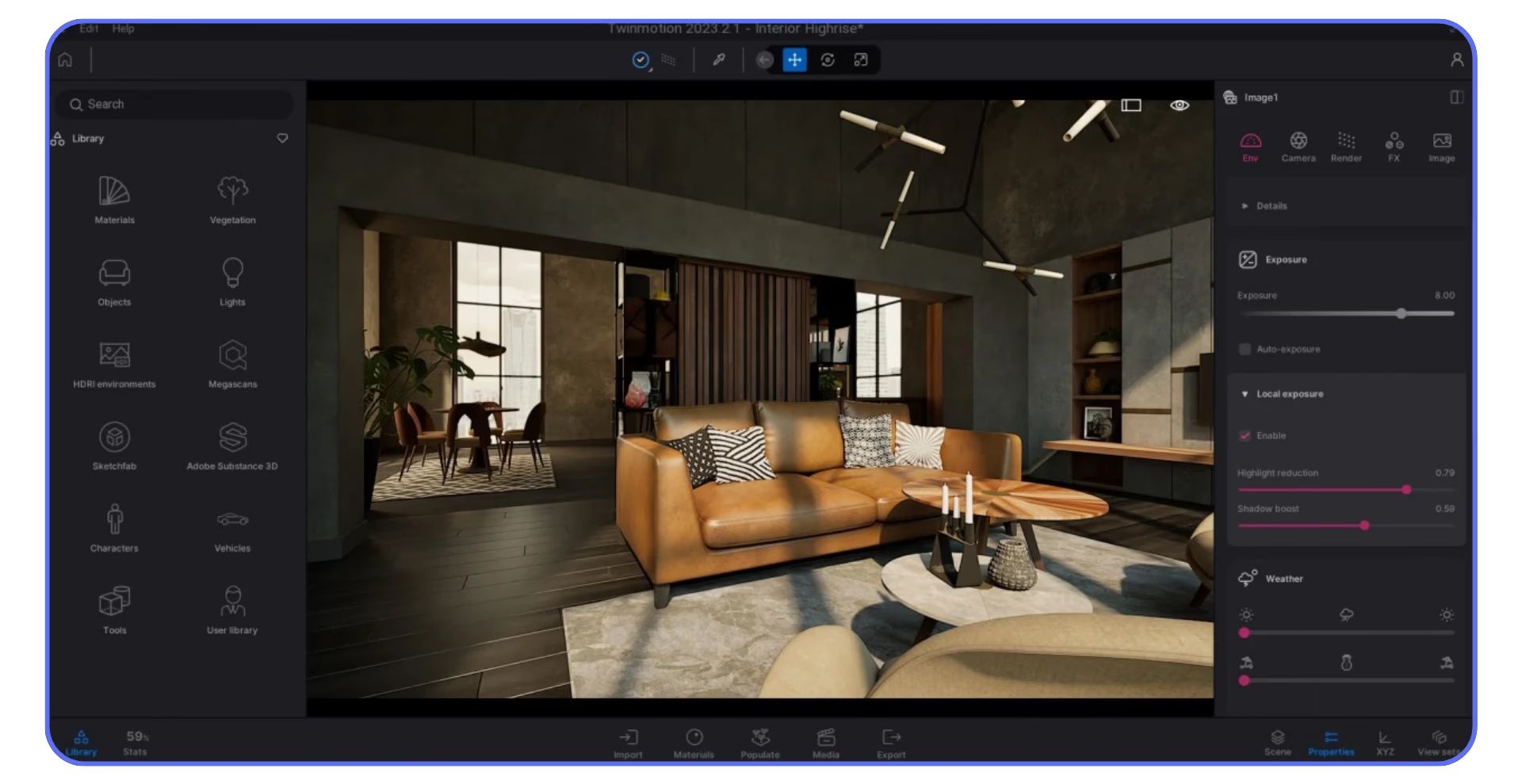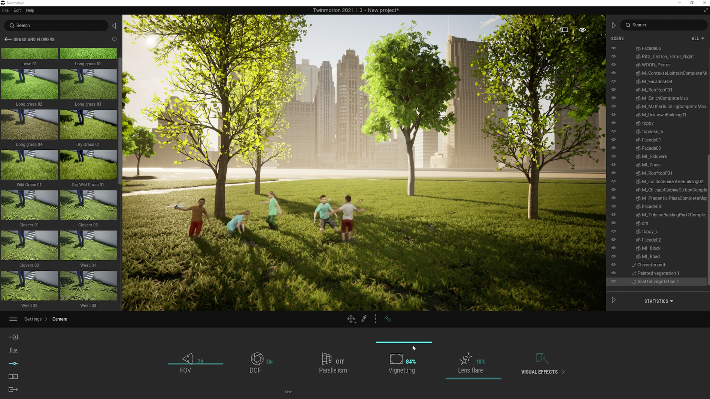 - 资产库:内置材质、植被、人物、车辆等资产,集成Megascans和Sketchfab;