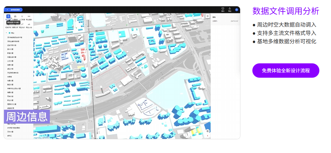 - 数据文件调用分析:周边时空大数据自动调入,支持多主流文件格式导入,基地多维数据分析可视化